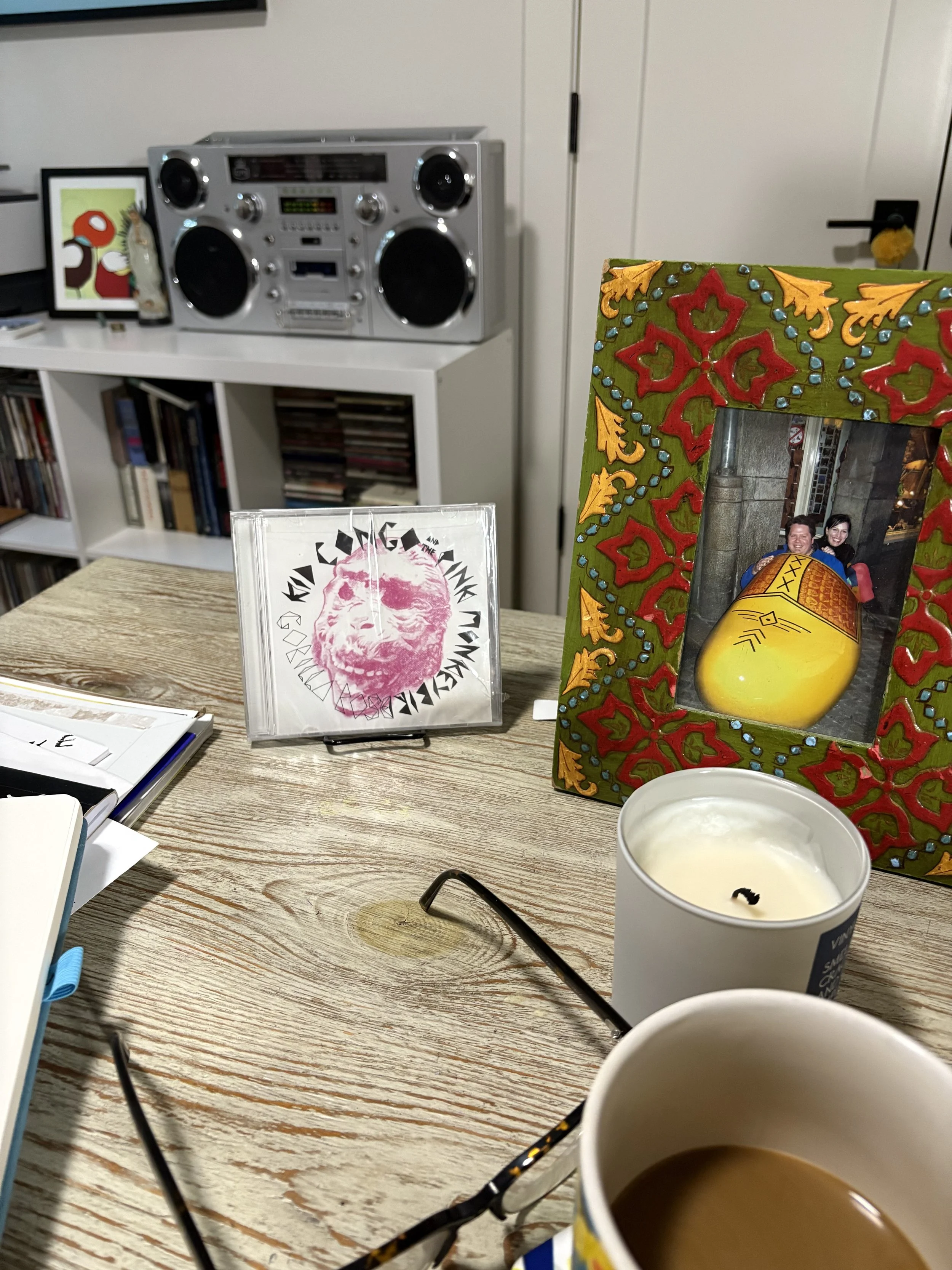 I have a little wire stand on my desk, don’t know what it was originally for, but it’s good for a cd or a small format zine or even a paperback book. A display tool that is highly refreshable. Right now I have a Kid Congo and The Pink Monkey Birds cd on it, Gorilla.