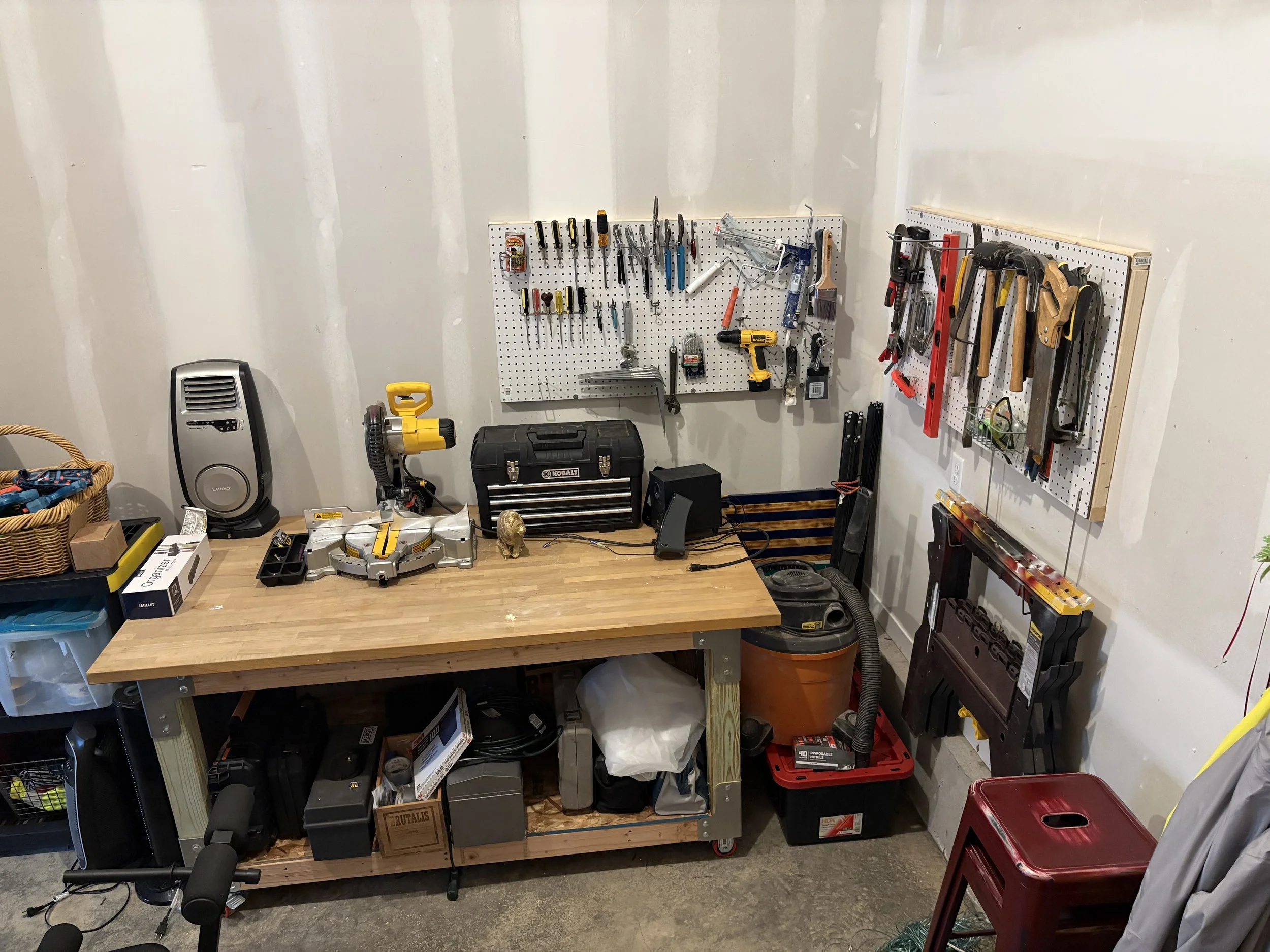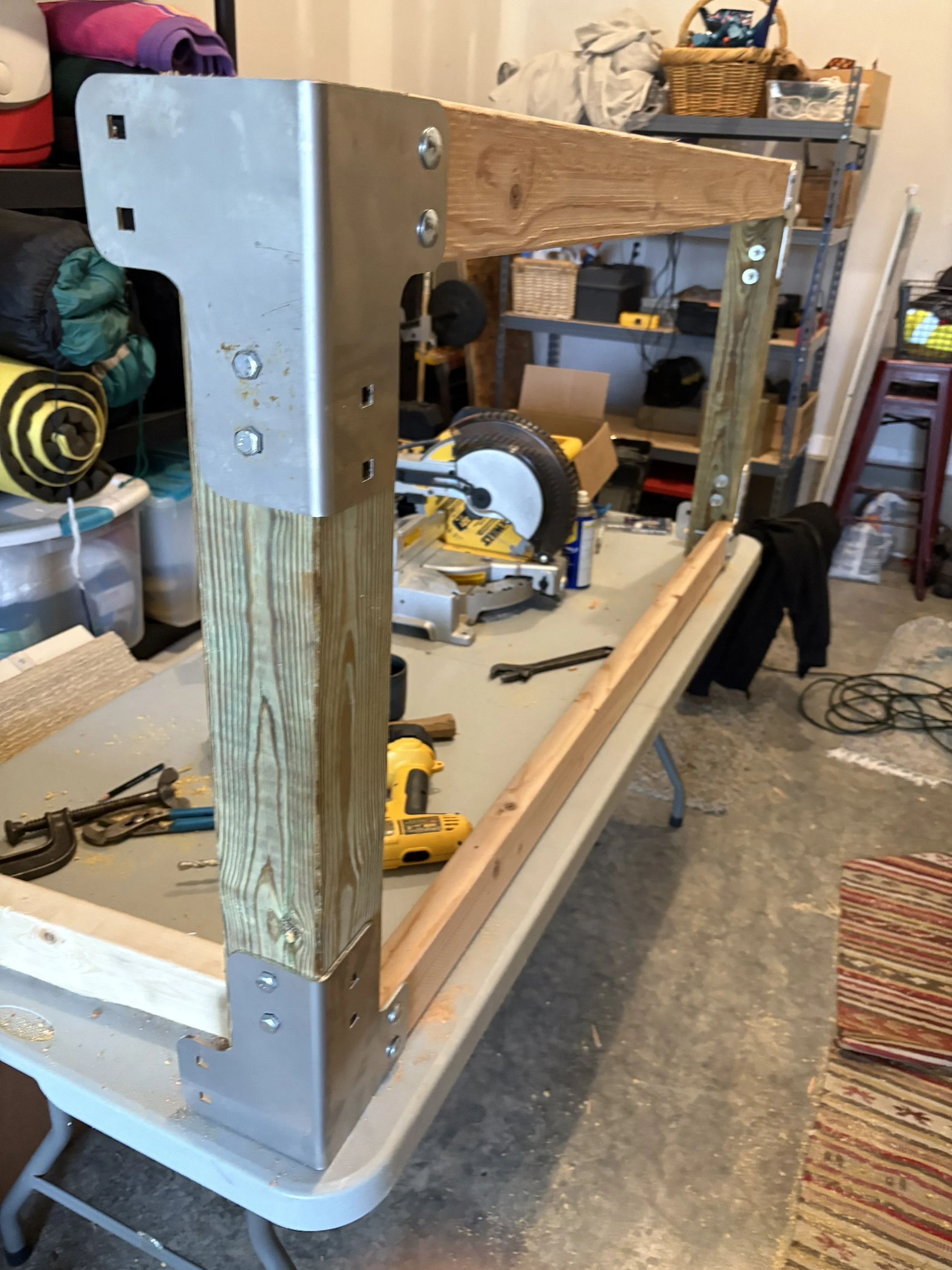 My blog is a workbench, but I haven’t been puttering on it much. I did build a real workbench using a tabletop from the giveaway pile at work and some rugged stainless steel brackets. It weighs about as much a U-boat though less floaty. The whole rig is a work in progress, like pretty much everything.